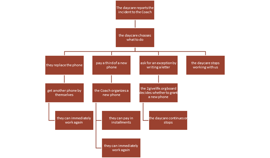 Whether a phone is lost, misplaced or stolen, the daycare is held accountable to take good care of the device. To continue the work with our organization, the daycares must make amends. They have three options: Replace the phone, pay a third of a new phone or stop working with us. If a daycare can’t afford to pay a second hand phone or a third of a new phone, they can write an apology letter to our organization.