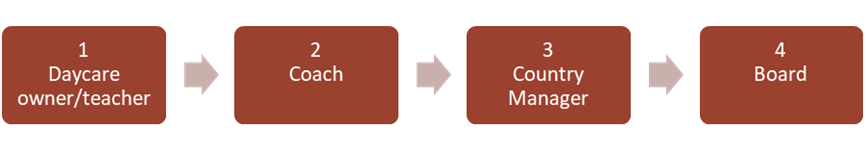 This is the order of the people involved in the process. The daycare owner/teacher is in contact with the Coach. The Coach must inform the Country Manager about every incident.
